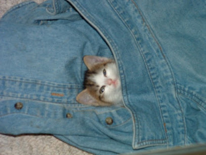 When I arrived home and parked my truck, I donned the jean shirt in order to conceal the cat until the big reveal. When I entered my house, my husband, Bob, was on his computer as usual. I stood in the doorway with a smile on my face. As I pulled back my jean shirt, the cat’s little head popped out.